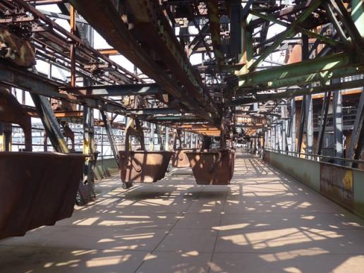 In der Möllerhalle wurden die Rohstoffe gelagert und mit Hängebahnwägelchen zum Hochofen transportiert. Von dort geht es dann wieder hinaus ins Freie und zu den sechs in Reihe stehenden Hochöfen.